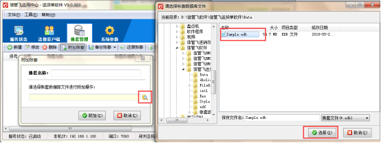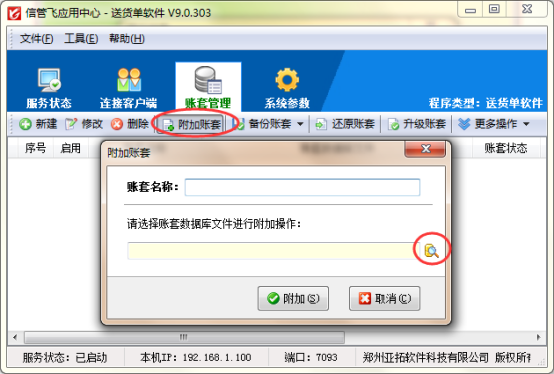 以信管飛送貨單軟件為例。示范下如何附加賬套?打開紅色的應用中心程序,選擇賬套管理界面,點擊工具欄中的“附加賬套”,點擊后會彈出附加賬套窗口,如下圖1所示: