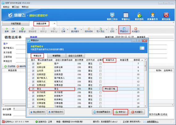 我們以信管飛RMS為例,示范下進(jìn)銷(xiāo)存管理軟件開(kāi)單錄入備注時(shí)如何彈出窗口錄入。首先打開(kāi)銷(xiāo)售出庫(kù)單界面,在工具欄中點(diǎn)擊“界面設(shè)計(jì)”打開(kāi)“界面設(shè)計(jì)”窗口,選擇“單據(jù)主體”中的備注項(xiàng),取值方式選擇“彈出窗口輸入”,然后保存設(shè)置,如圖1所示。