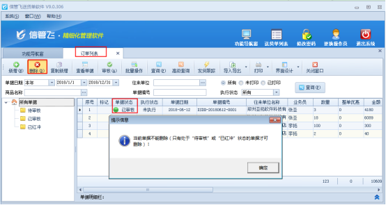信管飛送貨單軟件、信管飛RMS軟件等支持開(kāi)銷(xiāo)售單之前先開(kāi)訂單。銷(xiāo)售單可以引用訂單進(jìn)行開(kāi)單。對(duì)于剛下訂單出錯(cuò)或者取消訂單的,軟件支持刪除訂單操作。以信管飛送貨單軟件為例,示范下如何刪除已審核的訂單單據(jù)?