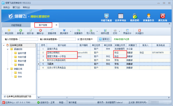 以“信管飛送貨單軟件”為例,示范下如何控制操作員僅能查看所屬為自己的客戶信息。首先需要在客戶信息中進行整理下客戶的所屬業務員信息,如下圖1所示,示例以員工“張亞”為例。
