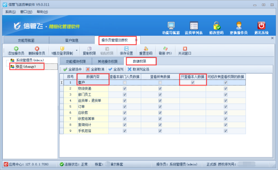 信管飛RMS軟件、信管飛倉庫管理軟件、信管飛送貨單軟件等都支持設置操作員權限,以控制操作員登錄軟件所顯示的功能,如公司需要限定操作員僅能查看和選擇自己所屬客戶信息,軟件中可以進行控制。