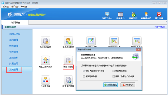 信管飛倉庫管理軟件、信管飛RMS、信管飛送貨單軟件等都支持對賬套進行初始化操作,下邊以“信管飛倉庫管理軟件”為例來演示下具體的操作步驟。