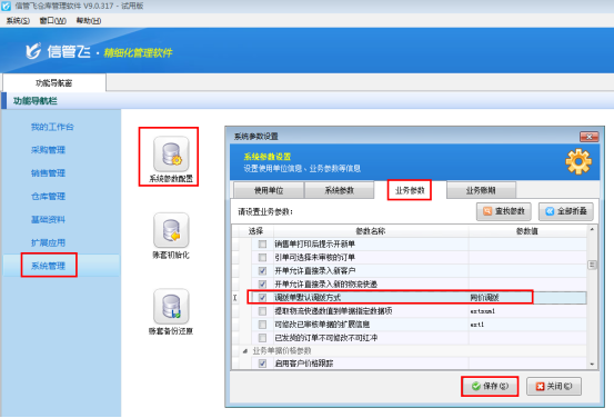 以信管飛倉庫管理軟件為例,首先設(shè)置參數(shù),在導(dǎo)航窗“系統(tǒng)管理”—》“系統(tǒng)參數(shù)配置”—》選擇“業(yè)務(wù)參數(shù)”的“調(diào)撥單默認(rèn)調(diào)撥方式”,后邊的參數(shù)值可選擇同價調(diào)撥或者變價調(diào)撥(示例選擇同價調(diào)撥)。勾選上此參數(shù)保存即可。如下圖所示: