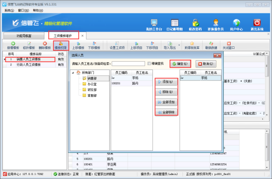 參數(shù)保存設(shè)置完成后,功能導航窗打開“綜合管理”—》“工資模板維護”界面,選擇工資模板“銷售人員工資模板”,點擊工具欄中的“模板權(quán)限”按鈕,選擇可查看此模板的操作員“李拓”進行添加確定。如下圖所示: