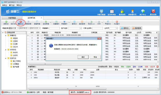 信管飛送貨單軟件中支持刪除單據,送貨單保存后如發現填寫錯誤,可以刪除,如圖1所示。