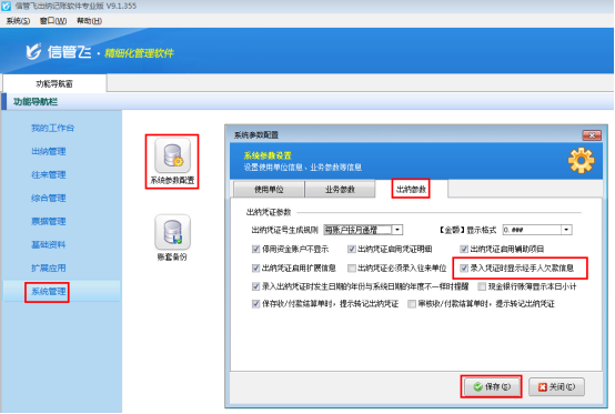 在功能導(dǎo)航窗點(diǎn)擊“系統(tǒng)管理”—》“系統(tǒng)參數(shù)配置”—》“出納參數(shù)”,即可進(jìn)入到“出納參數(shù)”配置界面,打鉤啟用“錄入憑證時(shí)顯示經(jīng)手人欠款信息”參數(shù),然后保存,如下圖所示:
