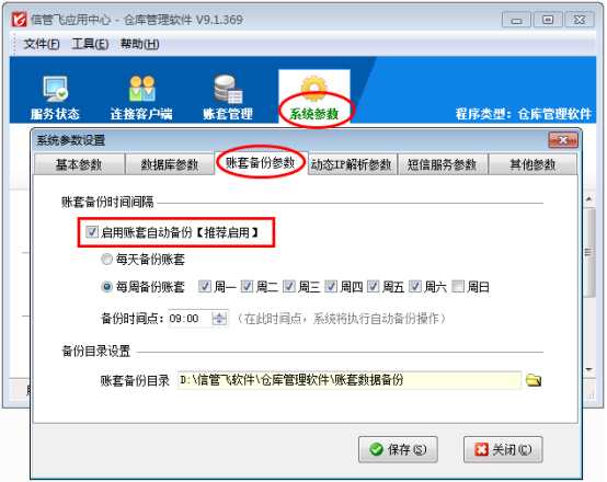 信管飛送貨單軟件、信管飛RMS、信管飛出納記賬軟件、信管飛倉庫管理軟件及信管飛票據軟件都支持設置賬套自動備份,我們強烈建議啟用自動備份功能,以便賬套出現問題的時候從賬套備份文件中恢復數據。下面我們以信管飛倉庫管理軟件為例詳細介紹一下如何啟用賬套自動備份功能?