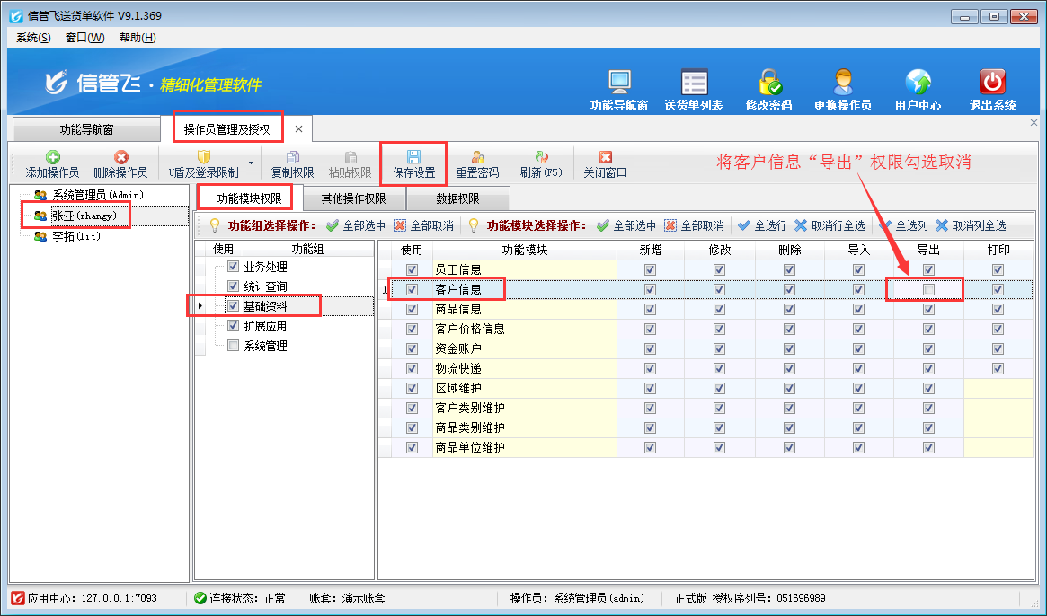 信管飛送貨單軟件、信管飛RMS、信管飛倉庫管理軟件等都支持管理基礎(chǔ)資料信息和允許設(shè)置多個操作員進行登錄軟件。軟件支持將基礎(chǔ)資料信息以EXCEL的形式導出放到自定義的文件夾內(nèi)以供備份或保存,如果需要設(shè)置操作員不允許導出客戶信息,如何設(shè)置?本文以信管飛送貨單軟件為例,示范下如何設(shè)置操作員不可導出客戶信息。