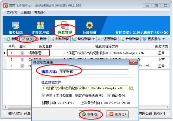 以“信管飛出納記賬軟件”為例,示范下如何修改賬套的名稱。打開紅色的應用中心程序(應用中心運行后桌面右下角會顯示相應的圖標,點擊即可打開應用中心主界面),在賬套管理界面,點擊賬套后選擇工具欄中的“修改”按鈕,彈出“修改賬套屬性”界面,把“演示賬套”修改為“出納賬套”,然后點擊“保存”按鈕,如下圖1所示: