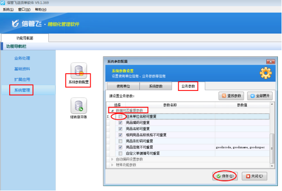 登錄軟件,在“系統(tǒng)管理”—》“系統(tǒng)參數(shù)配置”—》“業(yè)務(wù)參數(shù)”中的“數(shù)據(jù)可否重復(fù)參數(shù)”把“往來(lái)單位名稱可重復(fù)”的勾選符號(hào)取消,然后保存設(shè)置。如下圖所示: