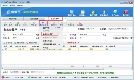 本文以“信管飛RMS標(biāo)準(zhǔn)版的收款結(jié)算單”為例,示范下如何把收款的金額轉(zhuǎn)記到日記賬中。