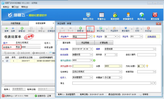 信管飛RMS標(biāo)準(zhǔn)版和專業(yè)版中增加了出納模塊,可以登記現(xiàn)金銀行日記賬。信管飛RMS 軟件中用戶在做收款結(jié)算后如需要把這筆賬管理到日記賬中,可以在收款時(shí)轉(zhuǎn)記到出納日記賬中。在軟件中如何操作呢?