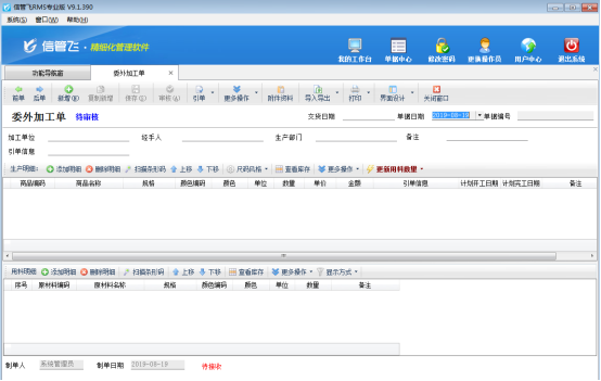 (2)當需要加工廠進行加工時,開“委外加工單”錄入加工任務,會根據生產模板自動算出需要的原材料明細。