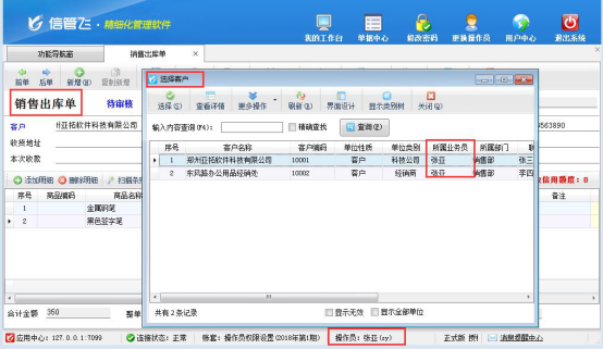 最后使用操作員“張亞”登錄軟件,在銷售管理中新開銷售出庫單,在選擇客戶界面可以看到僅能查詢到所屬于自己的客戶信息,如下圖所示: