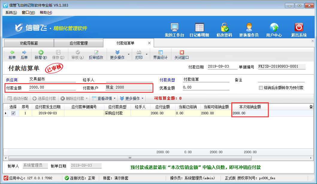 注意:付款結(jié)算單單據(jù)明細(xì)中“本次結(jié)銷金額”的合計(jì)金額,必須等于可結(jié)銷金額(付款金額 + 優(yōu)惠金額),否則無法保存付款結(jié)算單。