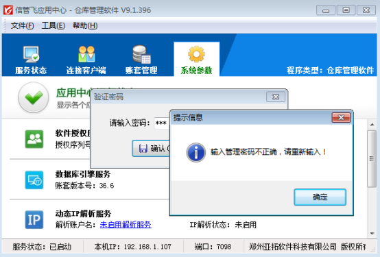 應用中心的管理和配置會對軟件的運行產生重大影響,因此軟件提供增強安全驗證功能,啟用安全驗證后執行賬套管理、系統參數設置等功能時會要求輸入密碼,驗證密碼通過后才可以進行相應操作。下面我們以信管飛倉庫管理軟件應用中心為例詳細介紹下如何啟用安全驗證功能。