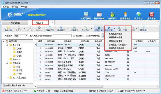 信管飛送貨單軟件、信管飛倉庫管理軟件、信管飛RMS軟件開單時都可以直接從商品信息中選擇已有的商品進行快速開單,軟件都支持對商品信息進行排序。開單添加明細時彈出的“選擇商品”窗口中商品信息顯示的先后順序如果需要調(diào)整,可以到商品信息中調(diào)整。下面我們以信管飛送貨單軟件為例介紹一下對商品信息排序的操作方法。