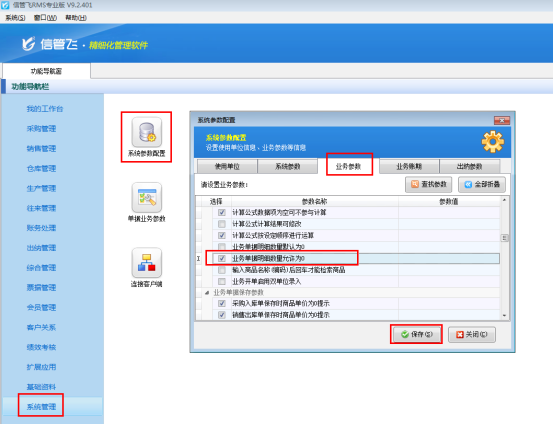 在功能導(dǎo)航窗點(diǎn)擊“系統(tǒng)管理”——》“系統(tǒng)參數(shù)配置”——》“業(yè)務(wù)參數(shù)”可以進(jìn)入到“業(yè)務(wù)參數(shù)”配置界面,在業(yè)務(wù)單據(jù)明細(xì)參數(shù)內(nèi)打勾啟用“業(yè)務(wù)單據(jù)明細(xì)數(shù)量允許為0”參數(shù),如下圖1所示。