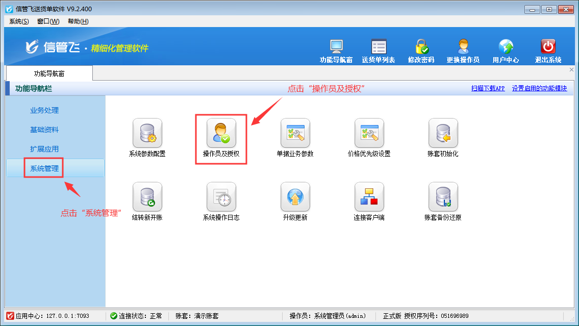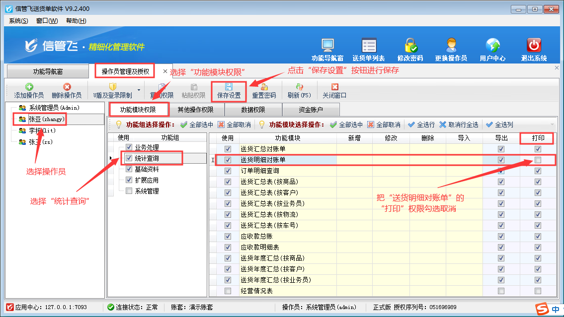 登錄軟件,在功能導(dǎo)航窗點(diǎn)擊“系統(tǒng)管理”—》“操作員及授權(quán)”,進(jìn)入“操作員管理及授權(quán)”界面,選擇操作員“張亞”,在其右側(cè)的功能模塊權(quán)限內(nèi)選擇“統(tǒng)計(jì)查詢”模塊,將送貨明細(xì)對(duì)賬單的“打印”權(quán)限勾選取消,然后保存設(shè)置,如下圖所示: