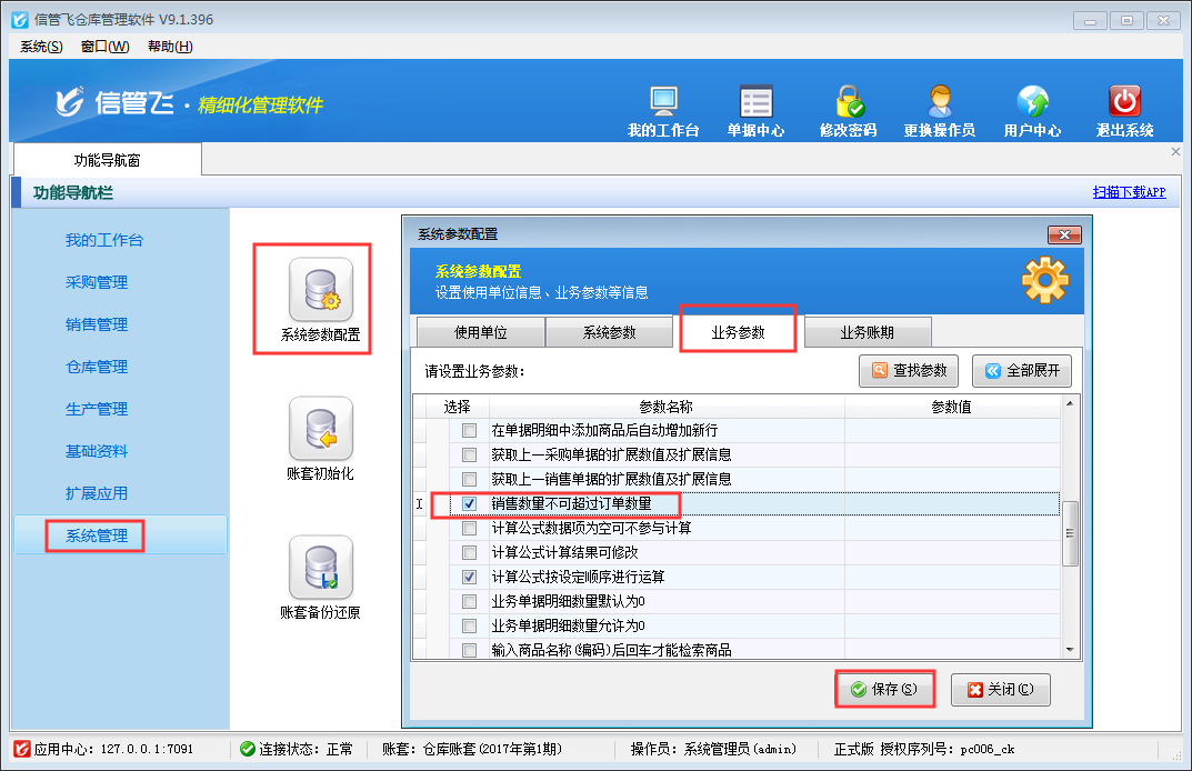 在功能導(dǎo)航窗點擊“系統(tǒng)管理”—》“系統(tǒng)參數(shù)配置”—》“業(yè)務(wù)參數(shù)”,即可進入到“業(yè)務(wù)參數(shù)”界面,勾選“銷售數(shù)量不可超過訂單數(shù)量”參數(shù),然后點擊“保存”按鈕保存配置,如下圖所示。