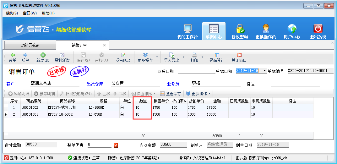 設(shè)置完之后,在功能導(dǎo)航窗點擊“銷售管理”—》“銷售訂單”,新增銷售訂單,添加兩條商品明細,數(shù)量分別為10,然后保存并審核銷售訂單,如下圖所示。