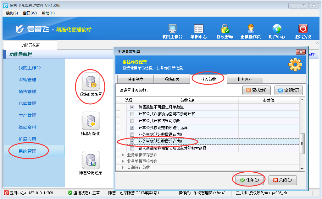 在功能導(dǎo)航窗點(diǎn)擊“系統(tǒng)管理”——》“系統(tǒng)參數(shù)配置”——》“業(yè)務(wù)參數(shù)”可以進(jìn)入到“業(yè)務(wù)參數(shù)”配置界面,在業(yè)務(wù)單據(jù)明細(xì)參數(shù)內(nèi)打勾啟用“業(yè)務(wù)單據(jù)明細(xì)數(shù)量允許為0”參數(shù),如下圖所示。