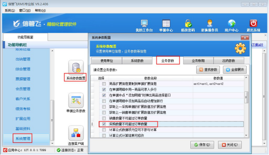 在功能導(dǎo)航窗點擊“系統(tǒng)管理”—》“系統(tǒng)參數(shù)配置”—》“業(yè)務(wù)參數(shù)”,即可進(jìn)入到“業(yè)務(wù)參數(shù)”界面,勾選“采購數(shù)量不可超過訂單數(shù)量”參數(shù),然后點擊“保存”按鈕保存配置,如下圖所示。