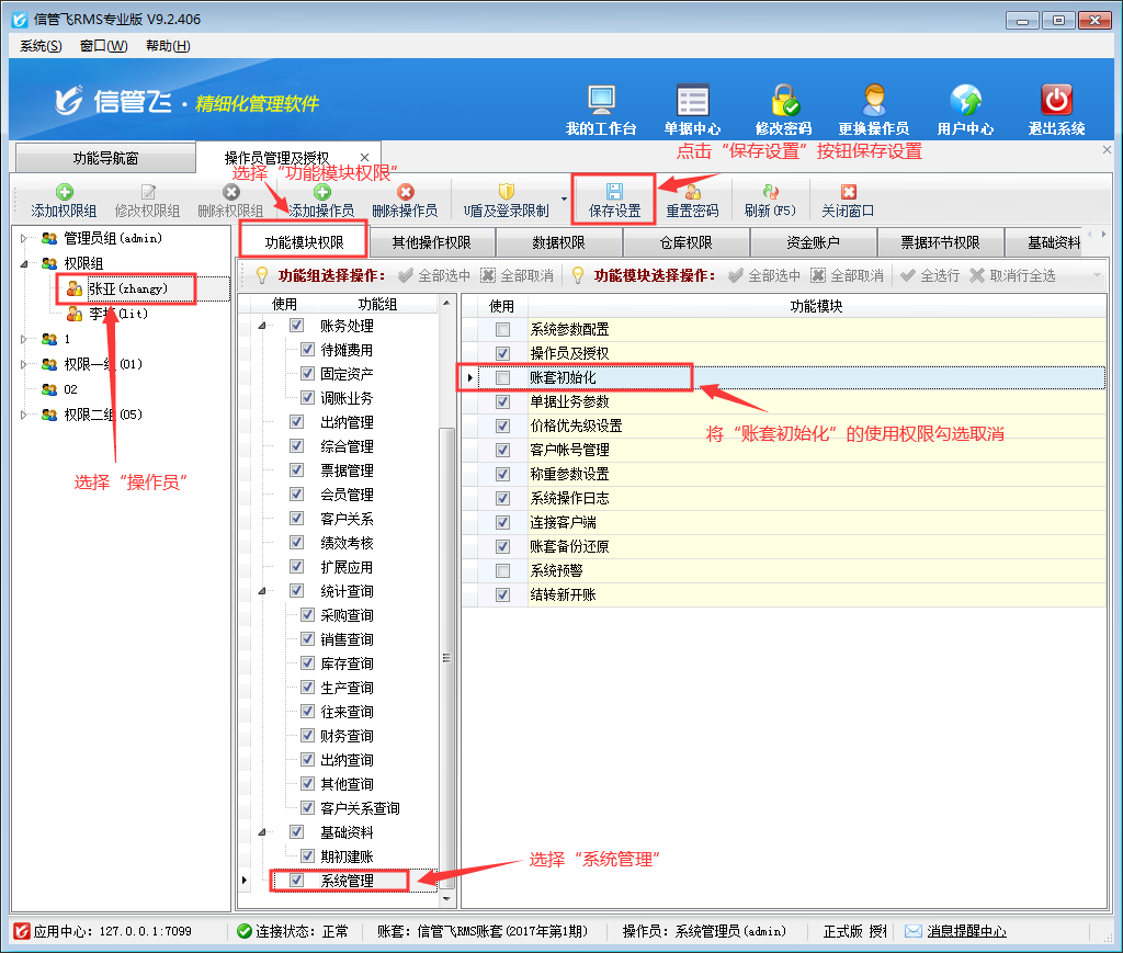登錄軟件,在功能導(dǎo)航窗點(diǎn)擊“系統(tǒng)管理”—》“操作員及授權(quán)”,進(jìn)入“操作員管理及授權(quán)”界面,選擇操作員“張亞”,在其右側(cè)的功能模塊權(quán)限內(nèi)選擇“系統(tǒng)管理”模塊,將賬套初始化的“使用”權(quán)限勾選取消,然后保存設(shè)置,如下圖所示。