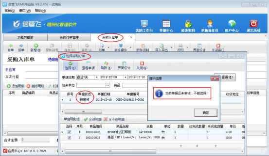 信管飛RMS軟件是集“采購管理、銷售管理、庫存管理、往來賬管理”一體的進(jìn)銷存軟件,軟件可引用訂單生成對(duì)應(yīng)的采購入庫單和銷售出庫單。軟件默認(rèn)引用訂單需要訂單處于審核狀態(tài),否則引用不了(如下圖所示),有的客戶存引用未審核的訂單,本文示范下如何設(shè)置?