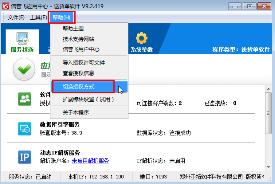 解決方法:(1)如果您有加密鎖,請檢查電腦是否已插入加密鎖,電腦USB接口是否正常;如電腦無法識別加密鎖,可以更換USB接口插入加密鎖;如加密鎖已損壞,請聯系我們在線客服解決。(2)如果您沒有加密鎖,是授權許可文件方式授權,請在應用中心程序中,點菜單“幫助”—》“切換授權方式”,切換授權方式后,請關閉應用中心程序,重新運行應用中心程序即可!如重啟應用中心程序后登錄仍提示此信息,建議再次切換授權形式后重啟應用中心程序(切換授權形式和退出應用中心程序兩次!)。如下圖所示: