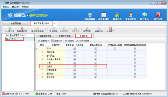 在功能導航窗點擊“系統管理”—》“操作員及授權”進入操作員管理及授權界面,選擇操作員“張亞”,然后在右側權限設置窗口點擊“數據權限”把應收款對應的勾選符號取消,然后保存配置,如下圖所示: