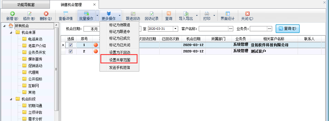 銷售機會管理用于管理在推銷過程中,由于環(huán)境發(fā)生變化,給銷售人員提供的實現(xiàn)其推銷目的的一種可能性,即銷售線索,各種途徑搜集過來的銷售業(yè)務(wù)信息(如客戶需求、購買意向、招投標(biāo)信息等)。銷售機會信息可根據(jù)共享范圍進(jìn)行設(shè)置,實現(xiàn)銷售機會的分級管理。本篇文章介紹一下如何批量設(shè)置銷售機會共享范圍?