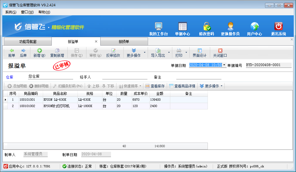 報(bào)溢單:如果軟件中庫存數(shù)量小于實(shí)際倉庫中的庫存數(shù)量,這時(shí)我們可以開報(bào)溢單進(jìn)行調(diào)整庫存數(shù)量。 在功能導(dǎo)航窗點(diǎn)“倉庫管理”—》“報(bào)溢單”,即可進(jìn)入操作界面,將相應(yīng)的倉庫、商品明細(xì)以及報(bào)溢數(shù)量填寫好進(jìn)行保存審核即可,報(bào)溢單保存審核后,單據(jù)明細(xì)中相應(yīng)商品的庫存數(shù)量增加,操作界面如下圖所示。