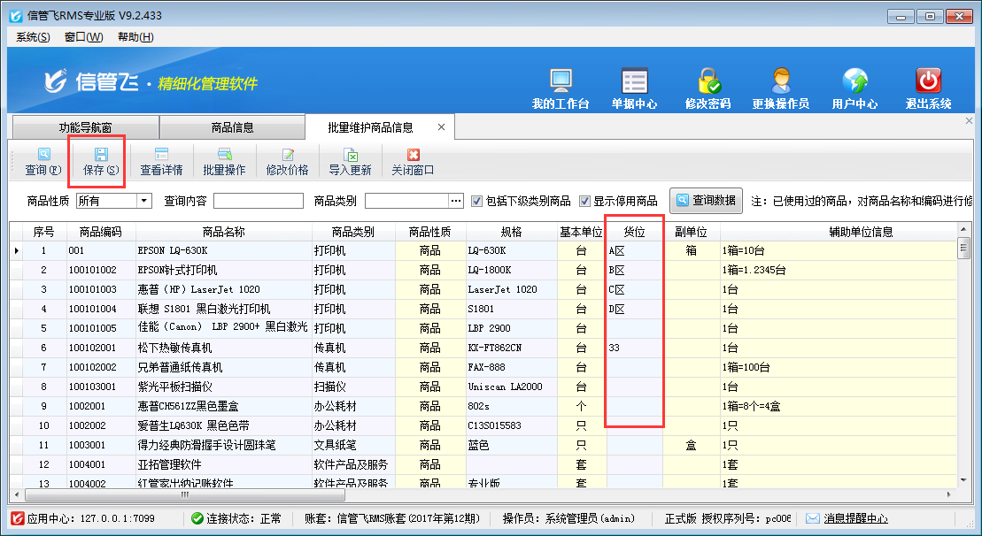 進入到批量維護商品信息界面,依次設置每個商品的貨位信息后在工具欄點擊“保存”按鈕保存設置即可,如下圖所示: