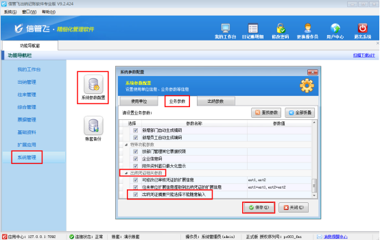 在功能導(dǎo)航窗點(diǎn)擊“系統(tǒng)管理”——》“系統(tǒng)參數(shù)配置”——》“業(yè)務(wù)參數(shù)”可以進(jìn)入到“業(yè)務(wù)參數(shù)”配置界面,在出納憑證相關(guān)參數(shù)內(nèi)打勾啟用“出納憑證摘要只能選擇不能隨意輸入”參數(shù),然后保存,如下圖所示: