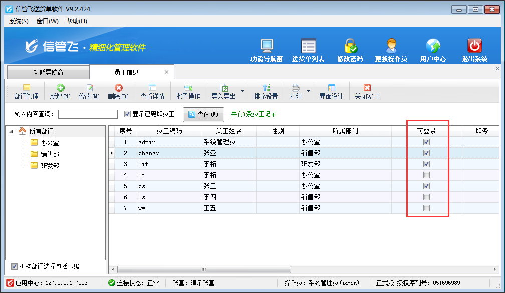 亞拓軟件旗下信管飛系列軟件(精細化管理軟件、出納記賬軟件、送貨單打印軟件、倉庫管理軟件等)都支持設(shè)置員工賬號可登錄軟件,但是部分用戶在設(shè)置員工賬號可登錄軟件時,發(fā)現(xiàn)“可登錄”是無法勾選的,如下圖所示,本文以送貨單軟件為例介紹一下如何設(shè)置員工賬號可登錄軟件?