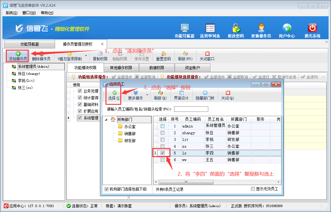 在功能導(dǎo)航窗點擊“系統(tǒng)管理”—》“操作員及權(quán)限”可以打開操作員管理及授權(quán)界面,然后添加操作員并設(shè)置一下操作員權(quán)限即可,如下圖所示,添加員工“李四”為操作員。