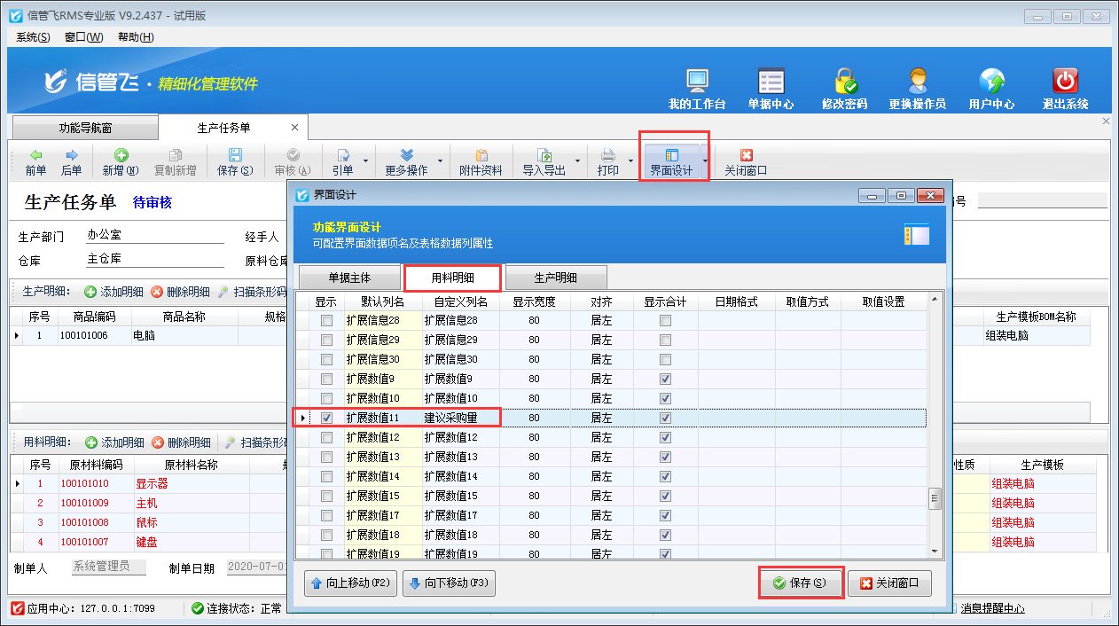 參數(shù)配置完成之后,打開生產(chǎn)任務(wù)單,在“界面設(shè)計”—》“用料明細”中將“擴展數(shù)值11”自定義列名為“建議采購量”,并勾選顯示出來,如下圖所示。