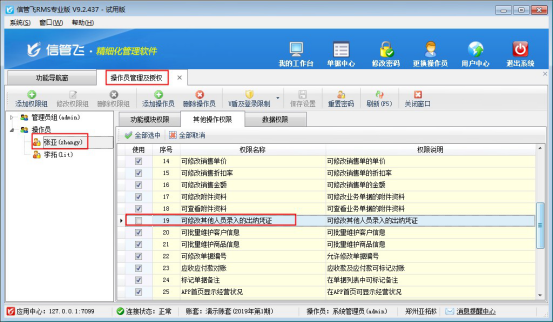 系統管理員登錄軟件,在功能導航窗點擊“系統管理”—》“操作員及授權”,進入“操作員管理及授權”界面,如下圖所示,選擇一個操作員,以操作員“張亞”為例,點擊“其他操作權限”,然后取消勾選“可修改其他人員所開出納憑證”,最后點擊“保存權限設置”,權限設置成功。
