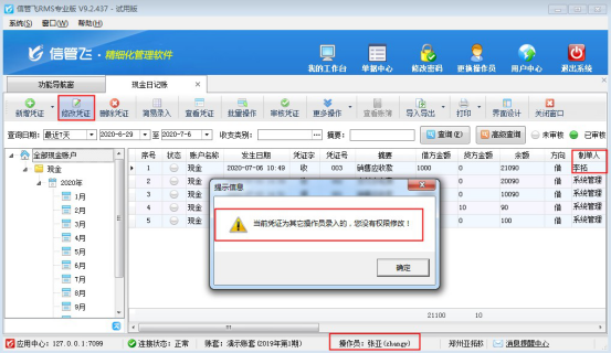 設置操作員權限之后,操作員“張亞”登錄軟件,在功能導航窗點擊“出納管理”—》“現金日記賬”,進入現金日記賬界面,選擇一個制單人為其他人員的日記賬憑證,然后點擊“修改憑證”按鈕,系統提示“當前憑證為其他操作員錄入的,您沒有權限修改!”,如圖所示。操作員“張亞”可以查看其他操作員所開的憑證信息,但在查看窗口同樣無法修改憑證信息,如圖所示: