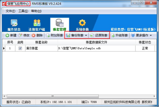 打開應用中心程序,選擇賬套管理界面,點擊備份賬套,可備份至電腦桌面上,把備份文件.dbk格式復制到U盤等存儲設備中進行保存即可,系統重裝好后,安裝軟件,在應用中心程序賬套管理界面點擊還原賬套,選擇備份數據進行還原即可。如下圖所示: