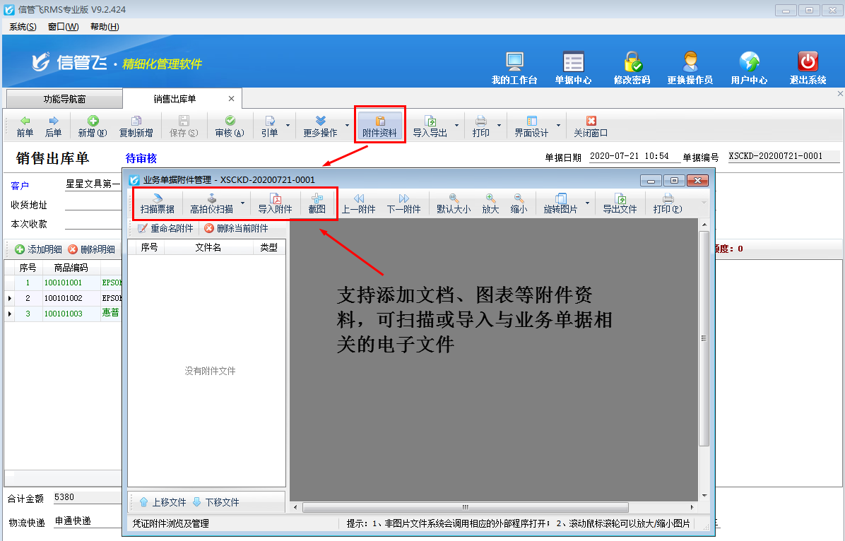 信管飛RMS(進銷存管理軟件)新增或者修改業務單據時,支持添加文檔、圖表等附件資料,可掃描或導入與業務單據相關的電子文件,方便用戶更全面、直接地查詢業務單據的全過程,有利于企業對業務單據的管理(如下圖所示),附加資料窗口默認顯示模式支持大窗口和小窗口兩種顯示模式,本文介紹一下如何設置附件資料窗口默認顯示模式?
