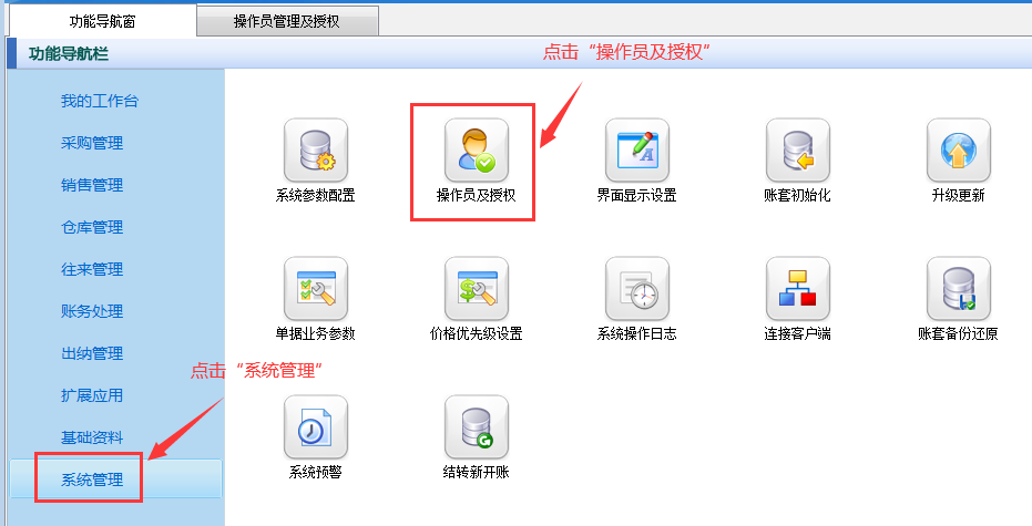 在功能導航窗點擊“系統管理”—》“操作員及授權”,進入“操作員管理及授權”界面,選擇操作員“張亞”,在其右側的功能模塊權限內選擇“擴展應用”模塊,將出入庫掃碼的“使用”權限勾選取消,然后保存設置,如下圖所示。