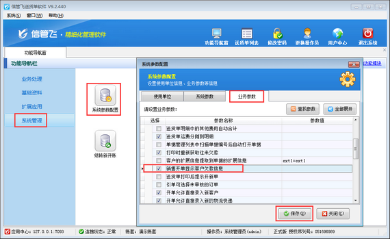 在功能導航窗點擊“系統管理”—》“系統參數配置”—》“業務參數”,即可進入到“業務參數”配置界面,在業務單據相關參數內打鉤啟用“銷售開單顯示客戶欠款信息”參數,然后保存配置,如下圖所示:
