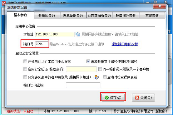打開應用中心程序,點擊“系統(tǒng)參數(shù)”,在基本參數(shù)中修改下端口號,比如送貨單默認端口號是7093,如果占用沖突,可修改為7094、7095...,修改后點擊保存,然后退出重啟應用中心程序,如下圖所示: