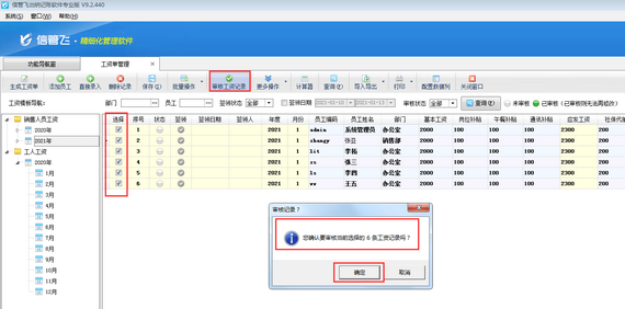 在功能導航窗點擊“綜合管理”—》“工資單管理”,打開工資單管理界面,在工資記錄列表中打鉤選擇要審核的工資記錄(工具欄點擊“批量操作”支持全選),然后點擊“審核工資記錄”,系統(tǒng)彈出提示信息“您確定要審核當前選擇的工資記錄嗎”,如下圖所示,點擊“確定”按鈕確定批量審核工資記錄。