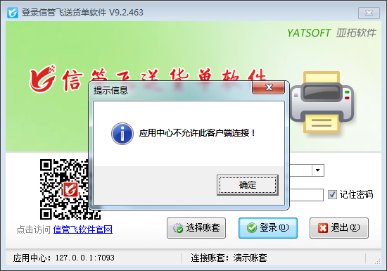 部分信管飛軟件用戶在登錄軟件時會出現(xiàn)軟件登錄不成功的情況,如下圖所示,系統(tǒng)彈出提示信息:應用中心不允許此客戶端連接!