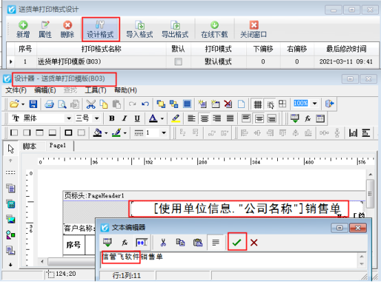 需要打印另外一個單位名稱“信管飛軟件”,首先需要復制一份相同打印格式,在開單界面打印按鈕下點擊“打印格式設計”,在打印格式設計界面可通過導出導入方式,導入一個和默認模板一樣的打印格式,選擇導入的打印格式點擊“設計格式”進入模板設計器界面,在模板設計器界面。雙擊打開抬頭的文本框,修改名稱為“信管飛軟件”后確定保存。如下圖所示: