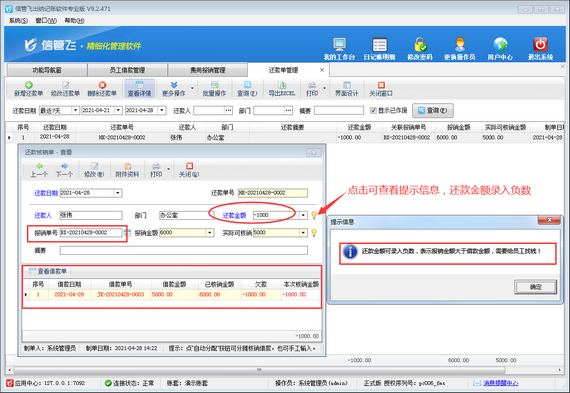 如下圖所示,員工“張偉”借款金額為5000元,費(fèi)用報(bào)銷了6000元,報(bào)銷金額大于借款金額,導(dǎo)致欠款-1000元,需退還給員工。這種情況下,需做還款單,進(jìn)行還款處理,將欠款金額清零。