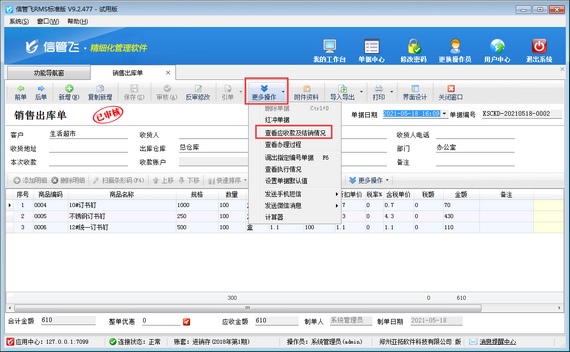 信管飛RMS是進銷存一體化的軟件,支持管理往來應(yīng)收應(yīng)付款,銷售出庫單審核后自動生成銷售應(yīng)收款信息,可以對銷售應(yīng)收款進行收款結(jié)算,如銷售應(yīng)收款已結(jié)銷的情況下,發(fā)現(xiàn)銷售出庫單有填開錯誤,需要修改,系統(tǒng)默認是不能直接進行反審修改操作,如下圖所示。